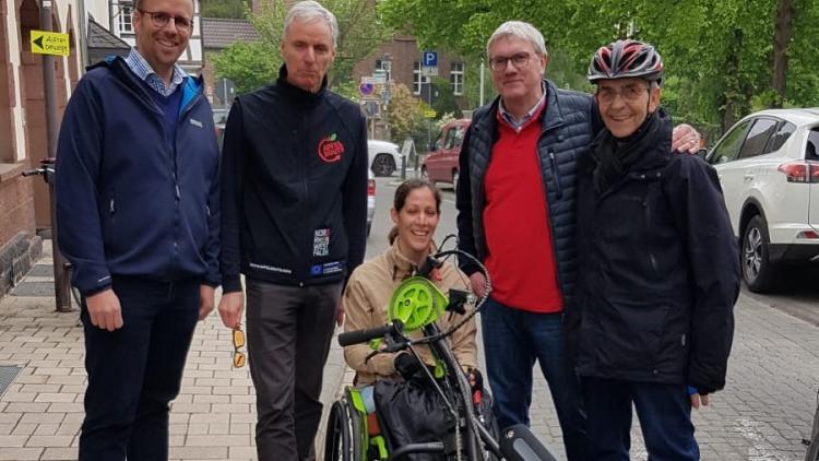 Im Anschluss starteten unsere Vorsitzende Miriam Clemens und unser Schriftführer Paul Breloh gemeinsam mit dem Landtagsabgeordneten Jörn Freynick, Landrat Sebastian Schuster und Bürgermeister Rolf Schumacher die Radtour durch die Gemeinde Alfter mit insgesamt 13 Stationen bei Alfterer Unternehmen und auf dem Campus I der Alanus Hochschule (Johannishof).